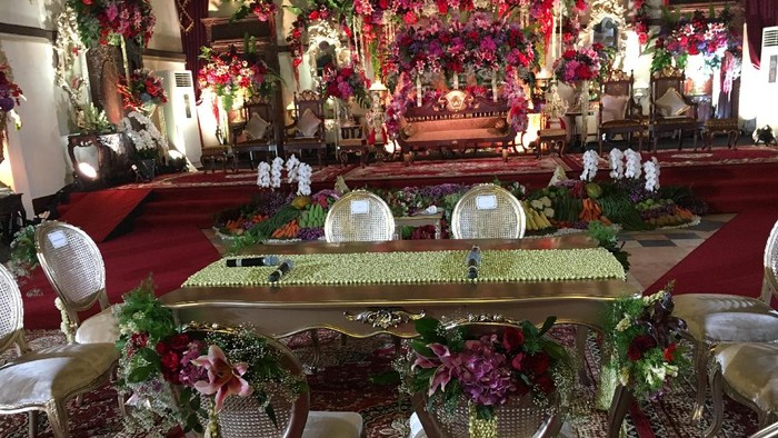 Pantauan detikcom, Rabu (8/11/2017) di Gedung Graha Saba Buana, Kelurahan Sumber, Banjarsari, Solo, Jawa Tengah, sebuah meja dengan 10 kursi telah diletakkan tepat di depan sebelum panggung utama pelaminan.