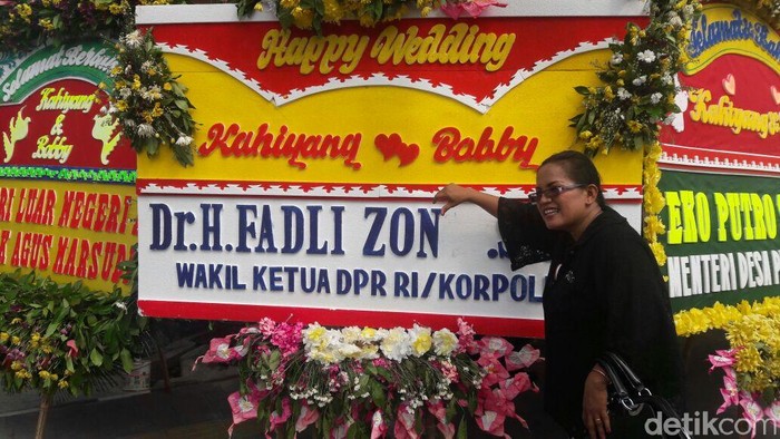 Sejumlah tamu pernikahan Kahiyang-Bobby berfoto dengan pose yang tampak meledek di depan karangan bunga dari Fadli Zon. Gelar di belakang nama Fadli Zon, yang semestinya SS MSc, bahkan diubah menjadi SMS. (bri/tor)