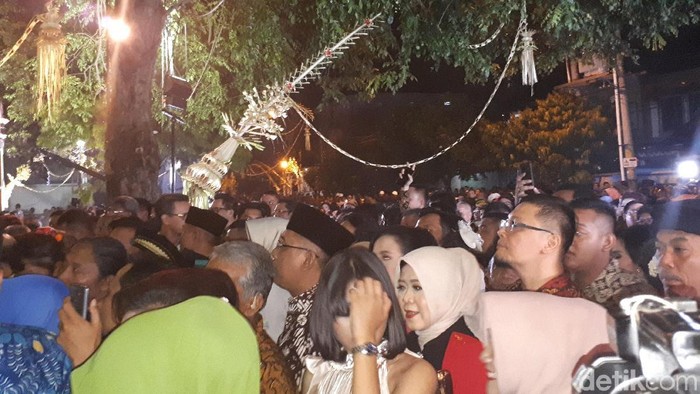Malam ini seluruh keluarga memakai pakaian adat Jawa. Jokowi memakai beskap beledu atau beludru hitam lengkap dengan belangkon. (sip/ams)
