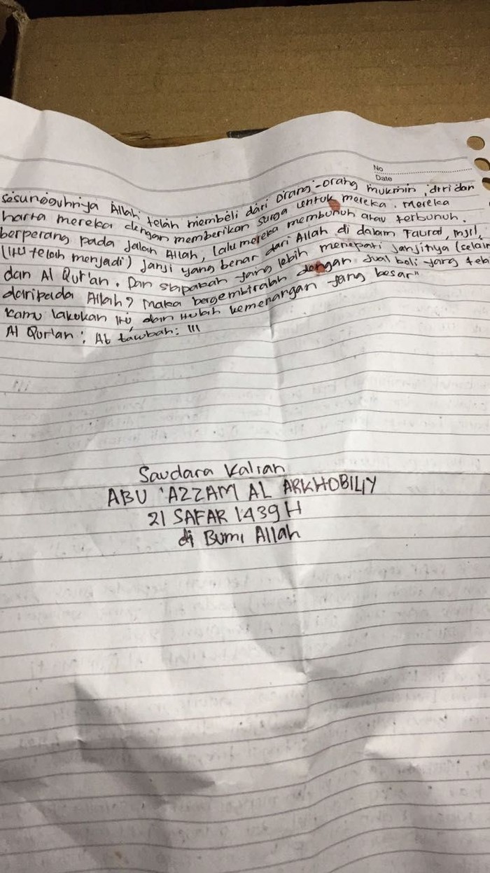Dari hasil penggeledahan terhadap dua jasad terduga pelaku, ditemukan sepucuk surat berisi pesan jihad. Tertera nama Abu Azzalam Al Arkhobiliy di bagian akhir surat itu.