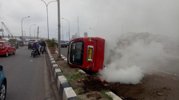 "Mobil itu dalam kondisi kencang dan oleng, tiba-tiba tabrak trotoar di flyover dan terbalik. Sopir langsung lompat dan kabur," kata salah seorang saksi mata di lokasi kejadian, Riswan (38), Senin (13/11/2017).