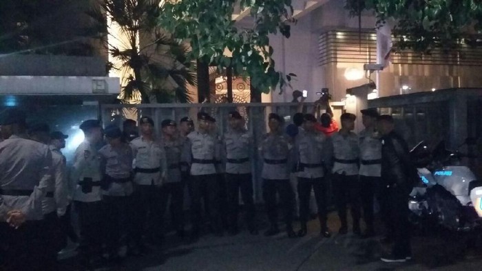 Sebagian polisi membentuk barikade di depan gerbang. Sebagian lainnya berjaga di depan pintu rumah.