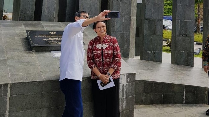Hal itu terlihat dari foto yang diterima detikcom dari Kementerian Luar Negeri. Retno yang mengenakan pakaian bermotif etnik berdiri di sebelah kiri Yasonna.