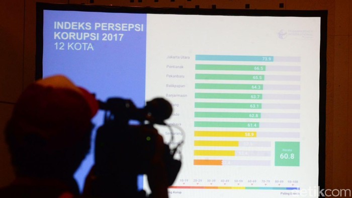 Peringkat itu disampaikan TII berdasarkan indeks persepsi korupsi (IPK) terhadap 12 kota di Indonesia. Jakarta Utara memperoleh skor 73,9, sedangkan Medan 37,4.