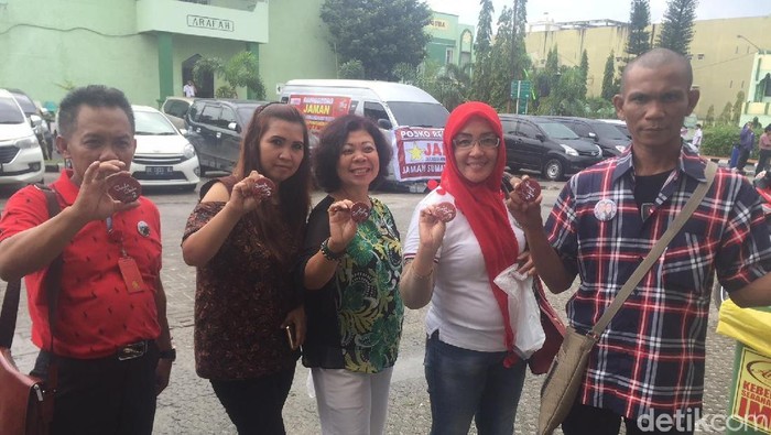 "Ada pin berwarna merah. Pin itu untuk relawan yang mengikuti kirab besok pagi," kata salah seorang relawan dari Seknas Jokowi, Dewi Kencana (57) saat ditemui di Asrama Haji Embarkasi Medan, Sabtu (25/11/2017).