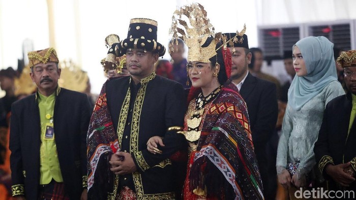 Pantauan di sekitar aula resepsi pernikahan Kahiyang dan Bobby, Bukit Hijau Regency Taman Setiabudi (BHR Tasbi), Medan, Sumut, Minggu (26/11/2017) pukul 07.35 WIB, terlihat dari jauh dekorasi khas rumah adat Batak Mandailing di pelaminan.