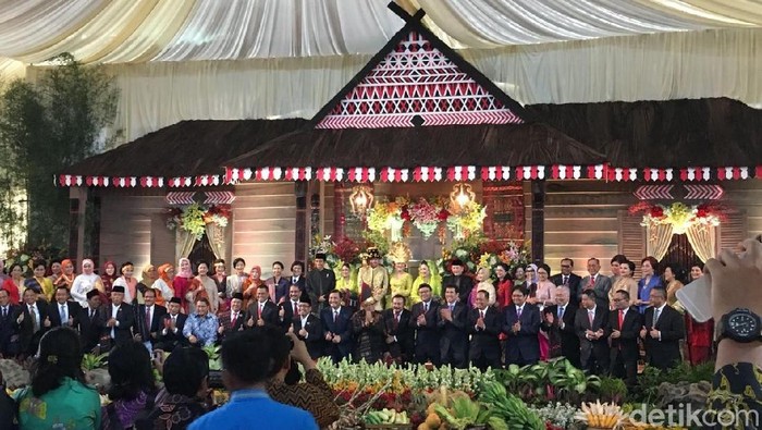 Tampak Pramono Anung beda sendiri dengan menggunakan pakaian adat batak lengkap dengan hiasan kepala. Kepala Staf Kepresidenan Teten Masduki juga menyampirkan kain ulos di pundaknya.