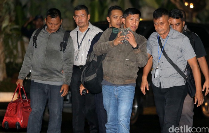 Kemudian di belakangnya menyusul lelaki berkaus hitam. Dia juga membawa ransel di punggung. Yang terakhir masuk adalah lelaki berjaket abu-abu. Sama dengan dua orang sebelumnya, dia memikul ransel sambil didampingi petugas KPK. (nif/dhn)