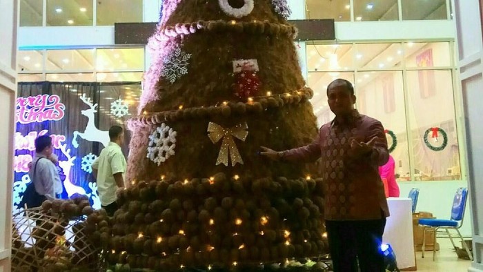"Bahan seratus persen limbah sabut kelapa. Belum pernah dibuat di mana pun. Mengingat Gorontalo banyak pohon kelapa dan sabutnya dibuang. Maka salah satu cara untuk meningkatkan penggunaan sabut kelapa ya dibuat pahon natal ini," ucap salah satu tim penggagas pohon Natal, AKBP Mosyan Nimitch, Jumat (8/12/2017).