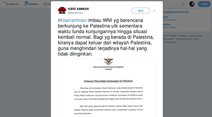 Dilansir dari akun Twitter @kbriamman, Jumat (8/12/2017), pihak KBRI Amman mengirim surat resmi berupa imbauan kepada WNI untuk membatalkan kunjungannya ke Palestina hingga situasi kembali normal.