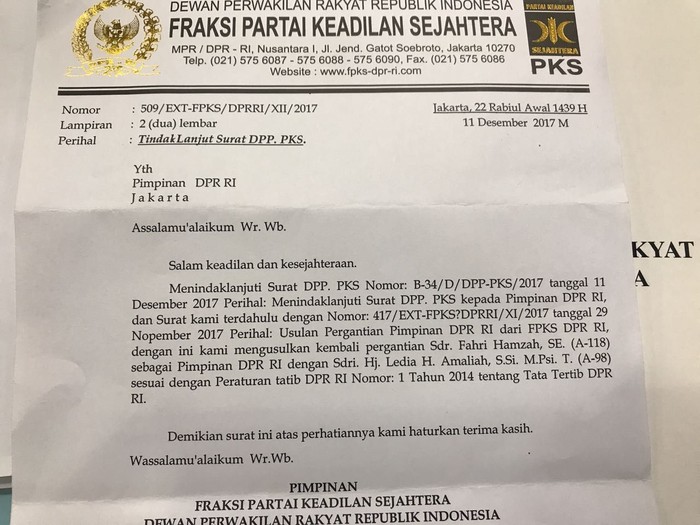 Menindaklanjuti surat DPP PKS Nomor B-34/D/DPP-PKS/2017 tanggal 11 Desember 2017 Perihal: Menindaklanjuti surat DPP PKS kepada Pimpinan DPR RI, dan surat kami terdahulu dengan Nomor: 417/EXT-FPKS?DPRRI/XI/2017 tanggal 29 Nopember 2017 Perihal: usulan pergantian pimpinan DPR RI dari FPKS DPR RI, dengan ini kami mengusulkan kembali pergantian Sdr. Fahri Hamzah, SE (A-118) sebagai Pimpinan DPR RI dengan Sdri. Hj. Ledia H. Amaliah, S.Si, M.Psi. T. (A-98) sesuai dengan peraturan tatib DPR RI Nomor: 1 Tahun 2014 tentang tata tertib DPR RI.