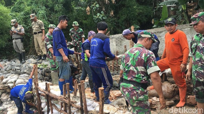 "Ini dari semalam kita sudah siapkan 300 karung tanah dan pasir, batu 3 kubik atau satu truk besar, bronjong 20 ukuran 2x1 meter, kayu dolken 100, pompa air satu," jelas Rengga.