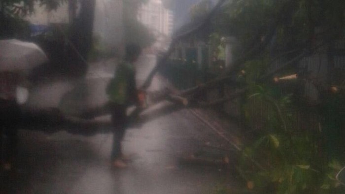 Petugas operator Posko Pohon Tumbang Dinas Kehutanan DKI, Safii melaporkan, pohon tumbang tersebut terjadi saat hujan deras disertai angin kencang. Saat ini petugas masih melakukan penanganan.