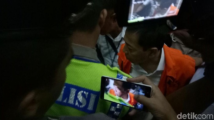 Dia datang dengan pengawalan polisi dan petugas KPK. Dia tiba memakai kemeja putih dan rompi tahanan KPK berwarna oranye.
