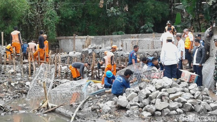 detikcom memantau pengerjaan perbaikan tanggul Kali Pulo di Jati Padang, Jakarta Selatan, Rabu (13/12/2017). Petugas Suku Dinas Tata Air Jakarta Selatan, Pasukan Oranye (PPSU), Dinas Pemadam Kebakaran dan TNI tampak sibuk bekerja.