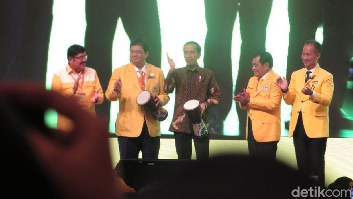 Jokowi dan Airlangga memukul gendang kecil atau jimbe sebagai penanda dibukanya munaslub. Presiden tampak tersenyum saat memukul jimbe beberapa kali.