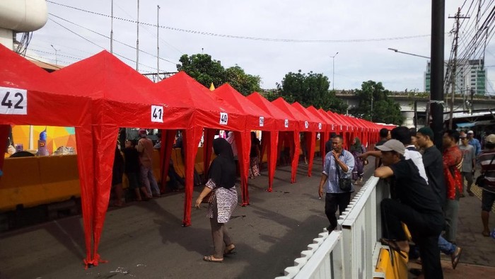 Pantauan di lokasi, Jumat (22/12/2017) pukul 09.10 WIB tenda-tenda berwarna merah untuk para PKL memang belum selesai dipasang semuanya. Masih terlihat petugas yang mendirikan tenda.