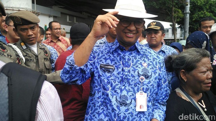 "Terima kasih," kata Anies kepada Lulung. Tak lama setelahnya, Anies langsung melepas topinya.