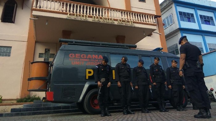Foto: Personel Gegana Brimob Polda Aceh melakukan penyisiran ke gereja-gereja di Aceh jelang misa natal. (Agus-detikcom)