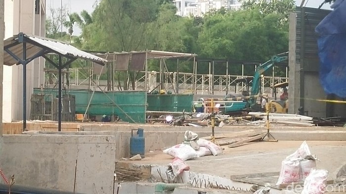 Pantauan detikcom di lokasi kejadian di Jl Cut Nyak Arief, Grogol Selatan, Jakarta Selatan, pukul 16.15 WIB, Rabu (27/12/2017), beberapa petugas yang mengenakan helm dan rompi oranye berkumpul di bangunan yang ditutupi terpal berwarna biru. Ada pula petugas yang berjaga di sekitar lokasi.