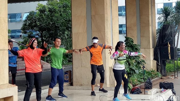 Sandiaga sempat berhenti senam untuk berswafoto dengan pegawai. Saat akan memasuki sesi pendinginan senam, Sandiaga meminta lagu 'Sayang' yang dipopulerkan Via Vallen.