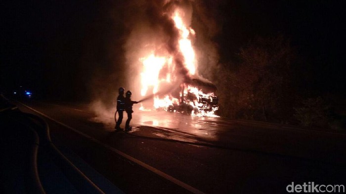 "Dugaan sementara karena pecah ban, lalu timbul percikan api," ujar Kasat Lantas Polres Karawang, AKP Arman Sahti kepada detikcom, Sabtu (6/1/2018).