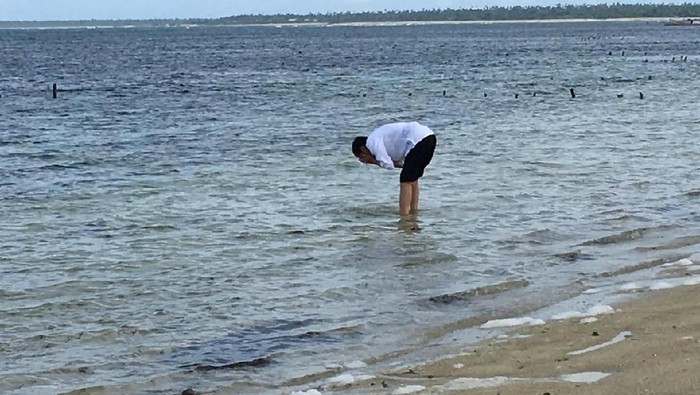 Tangannya menyentuh air dan merendam tangannya ke dalam air laut. Dia kemudian membasuh mukanya dengan air laut. Ada sekira 3 menit Jokowi di air laut itu.