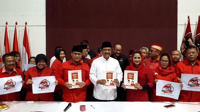 Pasangan Gus Ipul-Puti diantar ratusan kader dan pengurus DPD PDIP Jatim mendaftar ke KPUD. Mereka diiringi beragam kesenian tradisional, seperti barongsai, tari jaranan, reog, serta musik patrol.