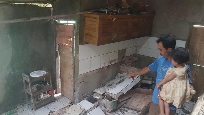 Salah satu warga yang rumahnya rusak parah bernama Solih (23) di kampung Pasir Kanyere. Meski tak rata dengan tanah, rumahnya sebagian besar retak. Dapur milik keluarga pun hancur berantakan.