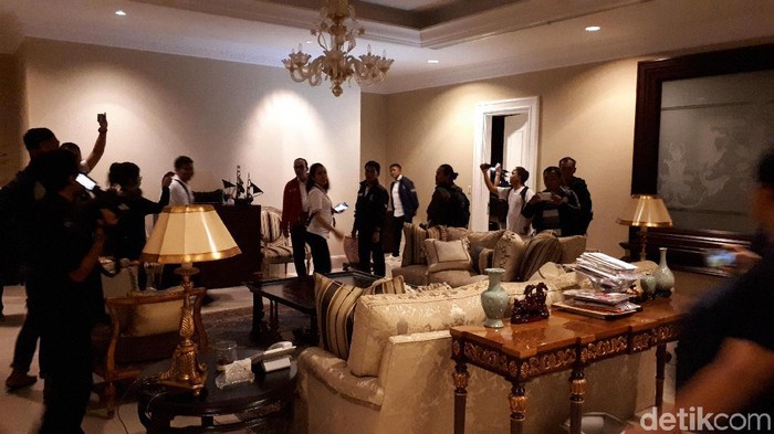 Ketua RT setempat ikut mendampingi kegiatan ini. Penggeledahan dimulai dari lantai dasar rumah dengan desain interior marmer dan didominasi warna emas itu. Di lantai tersebut, ada tiga kamar tidur, tuang tamu, ruang televisi, ruang tengah, dan dapur.
