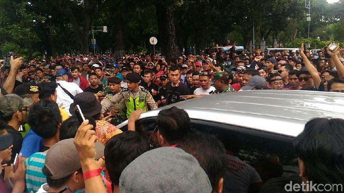 Aksi massa mengepung mobil terjadi sekitar 12.50 WIB, Senin (29/1/2018). Belum diketahui pemicu pengepungan mobil. Tiba-tiba massa merangsek ke jalur khusus bus Transjakarta (busway). Ada sejumlah orang melemparkan botol air mineral ke arah mobil.