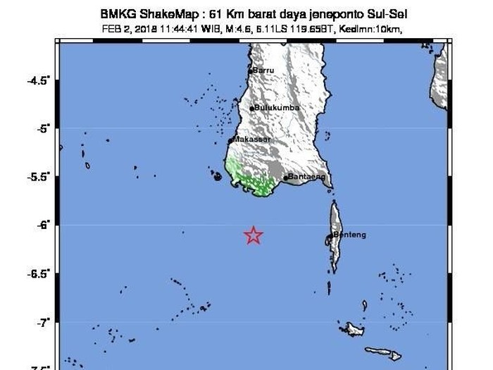 Episenter terletak pada koordinat 6.11 LS dan 119.65 BT tepatnya di laut pada jarak 61 km Barat Daya Kab. Jeneponto, pada kedalaman 10 km.