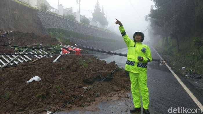 Hasby mengatakan, polisi terpaksa menutup total akses menuju ke atas Puncak. Titik lokasi longsor terjadi di dekat Masjid At-Taun.