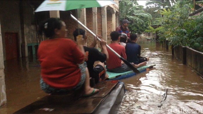 detikcom mencoba mengikuti proses evakuasi warga dengan menggunakan perahu karet. Terlihat kondisi rumah-rumah warga terendam air berwarna cokelat.