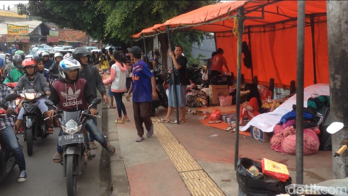 Pantauan detikcom, Selasa (6/2/2018) sekitar pukul 09.30 WIB, terlihat tenda berwarna jingga berada di atas trotoar Jalan Dewi Sartika. Tenda itu digunakan warga untuk tempat mengungsi akibat banjir luapan Sungai Ciliwung.