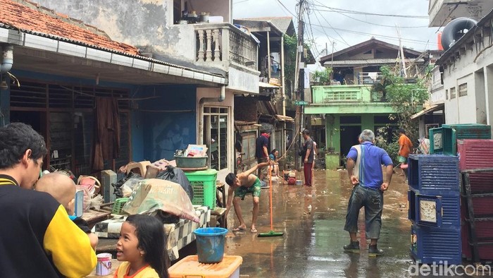 Pantauan detikcom di lokasi sekitar pukul 13.30 WIB, Selasa (6/2/2018), warga di Jl Bina Warga, Rawajati, masih bersih-bersih rumah. Mereka mengeluarkan endapan lumpur dengan serokan air.