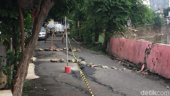 "Kalau melihat di lokasi sih, jadi mungkin kemarin waktu ada banjir kiriman itu turapnya agak miring tuh. Karena turapnya itu turun, jadi posisi jalannya jadi ketarik, jadi pada retak," kata Juani saat dihubungi detikcom, Rabu (14/2/2018).