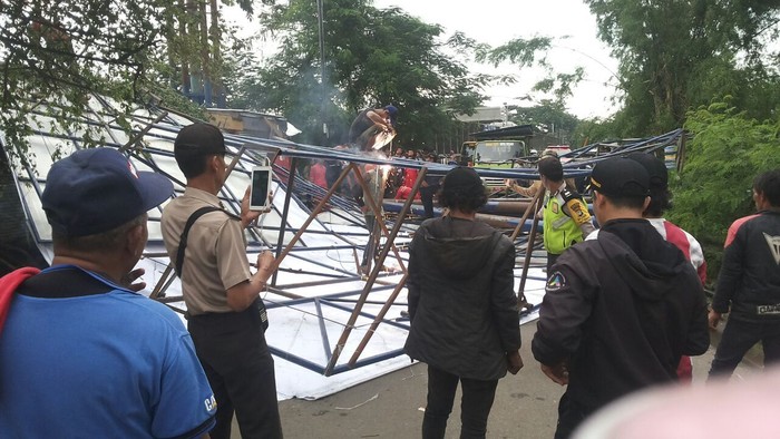 Petugas memotong reklame yang roboh (Foto: dok. Polsek Pondok Gede) |