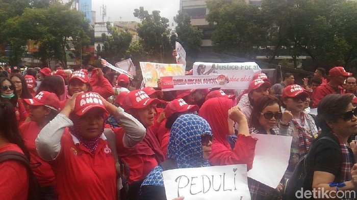 Pantauan di depan PN Jakut, Jl Gajah Mada, Jakarta Pusat, Senin (26/2/2018) pukul 10.30 WIB, massa kontra Ahok yang tergabung dalam LPI dan massa pro Ahok yang tergabung dalam Komunitas Bangsa Bersatu terlihat masih berada di depan Gedung PN Jakut.