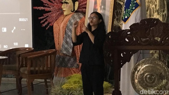 Penerjemah yang berada di panggung menerjemahkan penjelasan Anies dalam paparan. "Kita fasilitasi kaum disabilitas biar tahu juga soal konsep penataan trotoar," lanjutnya.