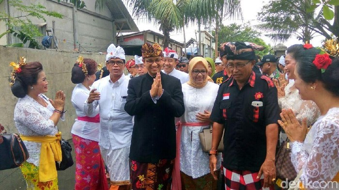 Anies dipersilakan memberikan sambutan oleh pihak panitia Melasti di Pura Segara, Cilincing, Jakarta Utara, Minggu (11/3/2018) sekitar pukul 16.20 WIB. Anies mengenakan beskap hitam dan udeng.