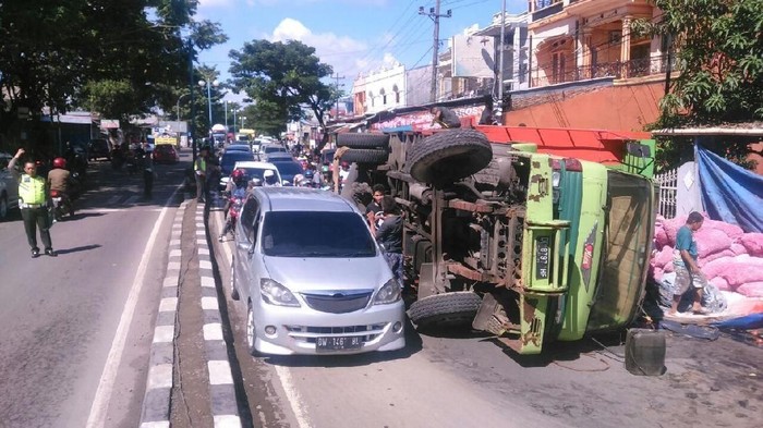Truk dengan nomor polisi DP-8797-AF ini melaju dari arah Makassar menuju gudang penampungan bawang yang ada di Maccopa, Kecamatan Mandai, Maros. Butuh sekitar satu jam untuk truk ini bisa dievakuasi ke pinggir jalan. Menggunakan mobil kontainer, truk yang terguling itu ditarik berkali-kali.