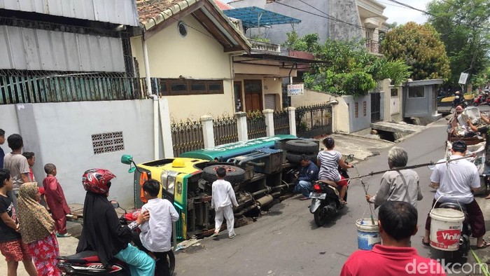 |  Foto: Truk tangki air terguling ke got di Matraman, Jakarta Timur. (Nugroho-detikcom) |