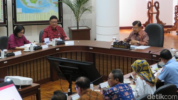 JK memimpin rapat di kantornya, Jalan Medan Merdeka Utara, Jakarta Pusat, Senin (26/3/2018). Hadir dalam rapat tersebut Menteri Keuangan Sri Mulyani Indrawati serta Menteri Dalam Negeri Tjahjo Kumolo.