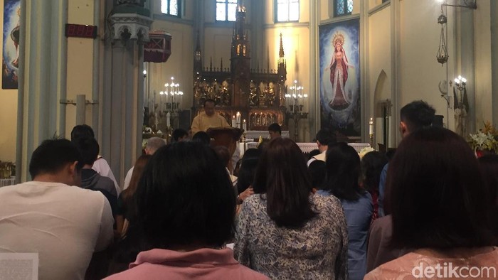 Pantauan detikcom di lokasi, Gereja Katedral, Jakarta Pusat, Minggu (1/4/2018), umat yang terdiri dari anak-anak hingga orang dewasa tampak mengikuti misa dengan khusyuk. Ada yang duduk di dalam ruangan, ada juga duduk di bagian sisi kiri dan bagian luar gereja.