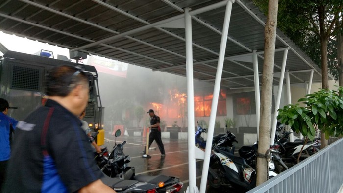 "Penanganan Kebakaran Gedung SDM Polda Metro Jaya sementara menggunakan mobil Water Canon," tulis akun Twitter @TMCPoldaMetro pada pukul 15.45 WIB, seperti dilihat detikcom, Sabtu (7/4/2018).