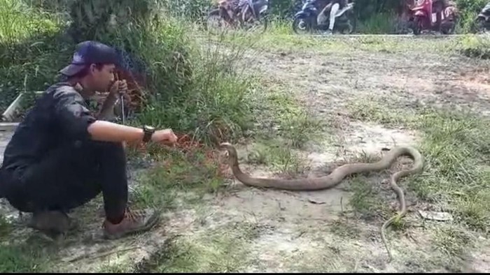 Saat bermain, Amar tidak canggung memegang tubuh king kobra. Sesekali ia memegang kepalanya dan saling menatap. King kobra menggeliat, entah apa yang dipikirkannya. (cha/asp)