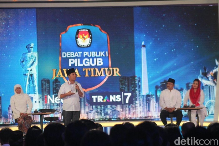 "Jawa Timur pertumbuhan ekonomi di atas rata-rata, ekspornya tertinggi di semua provinsi, migas kedua setelah Riau. Dari pertumbuhan yang tinggi, kita melihat ada PR. Jantung republik ini ada di Jawa Timur, tidak boleh ketimpangan tidak cepat diatasi. Kemiskinan di Jatim menggelembung di pedesaan 15,58 persen, di perkotaan 7,7 persen. Jadi apa yang sudah dilakukan Gus Ipul selama 9 tahun ini?" kata Khofifah mengawali perdebatan arena debat perdana cagub Jatim di Dyandra Convention Center, Surabaya, Selasa (10/4/2018).
