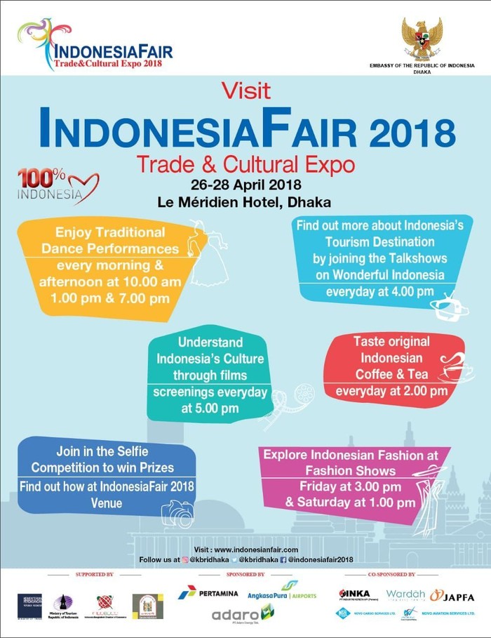 "INDONESIAFAIR 2018 akan menjadi pameran produk dan budaya paling komprehensif yang diselenggarakan di Bangladesh," demikian keterangan dari Kedubes RI untuk Bangladesh, Jumat (20/4/2018).