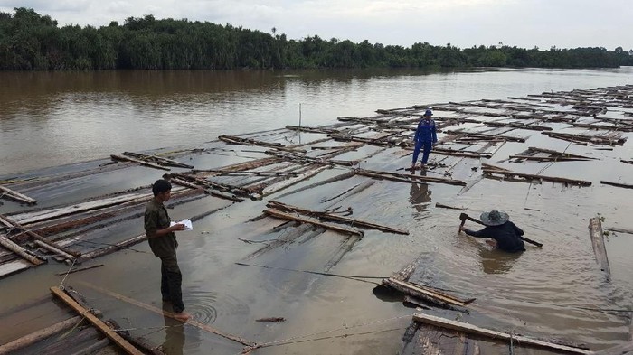 Sejauh mata memandang terlihat kayu telah dirakit dan siap untuk ditarik pakai kapal tongkang. KLHK menyebut jika telah diolah, harga kayu jenis meranti dan campuran ini diperkirakan mencapai Rp 450 juta lebih. (asp/asp)